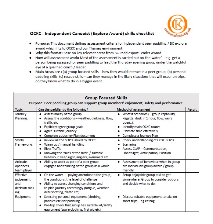 British Canoeing introduced Personal Performance Awards in January 2019 – Paddle Start, Paddle Discover, Paddle Explore. The awards are designed to be relevant to the individual paddler’s goals, and the environment they paddle in. Paddle Explore is our standard for peer paddling – at this level the paddler will be able to enjoy our paddling trips safely, and support other paddler in the event of an incident. The explore award assessment checklist is below.